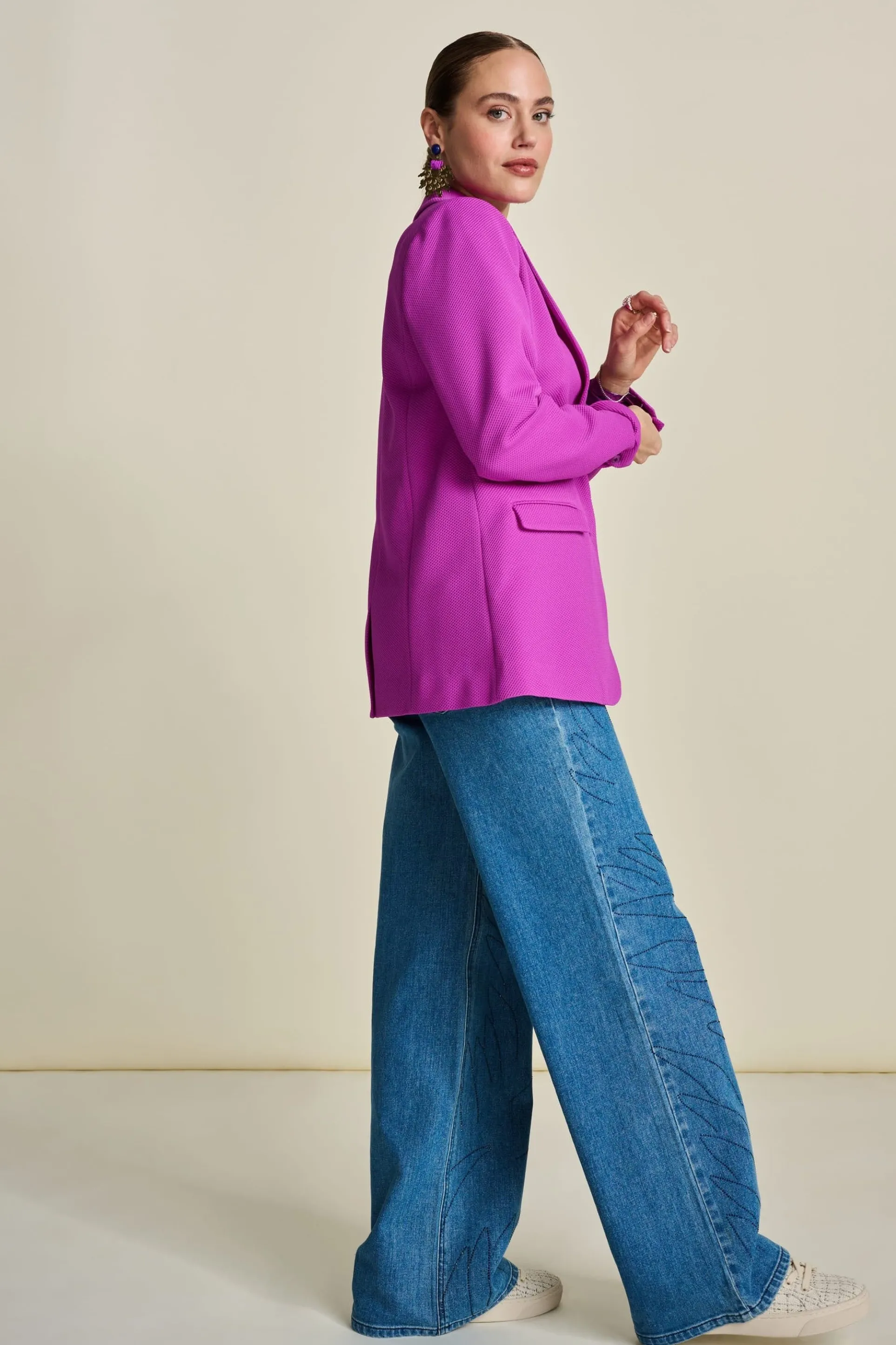 Deze roze blazer is een echte eyecatcher in je kast. De blazer is gemaakt van 90% recycled polyester en gevoerd met een handgeschilderde print. Combineer dit jasje met de bijpassende broek voor de complete look.