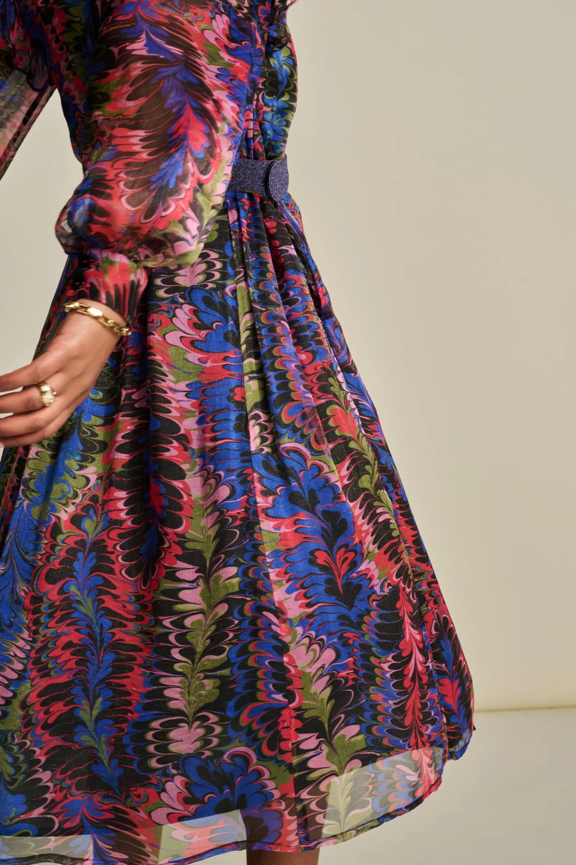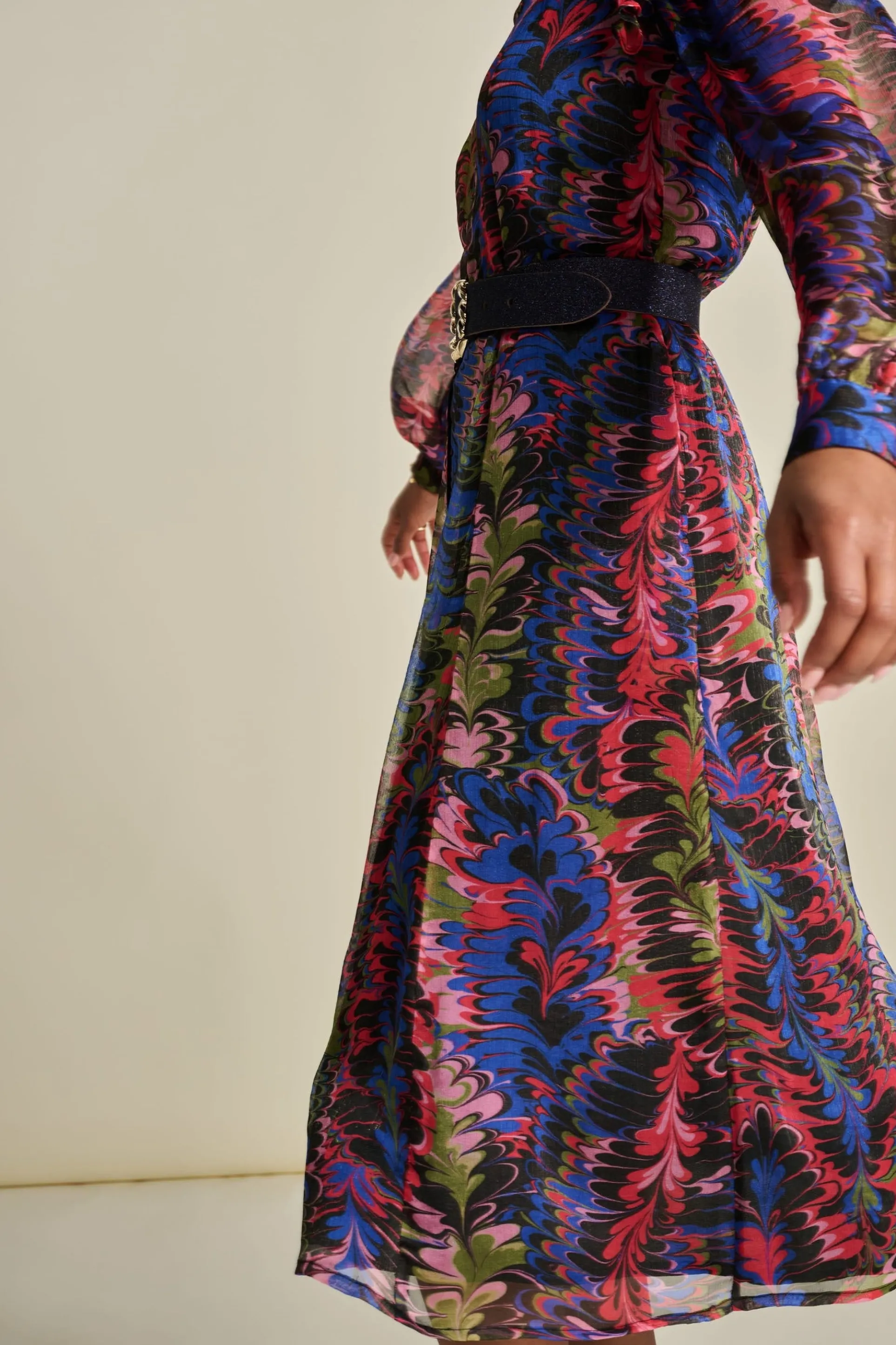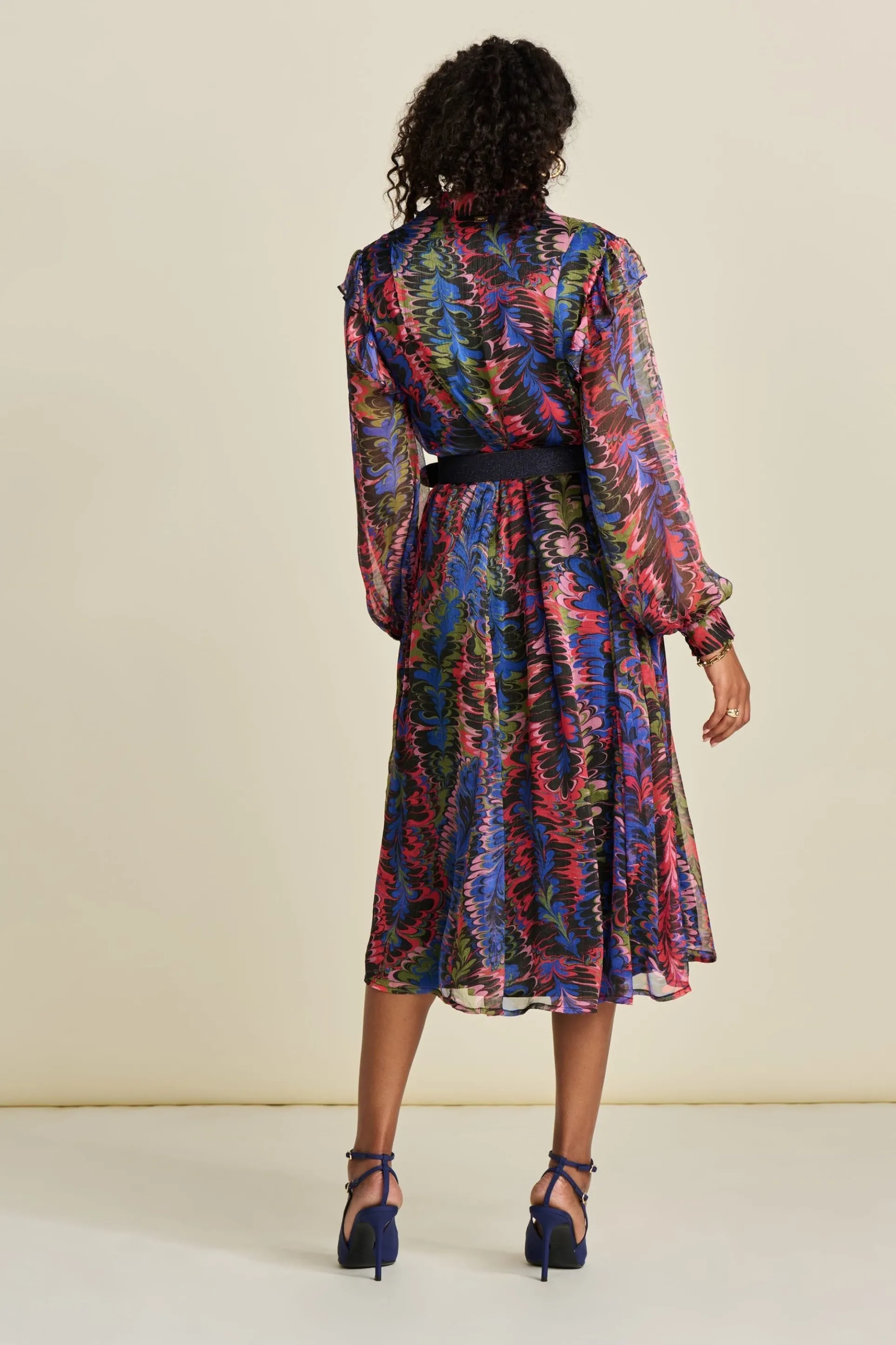 Deze semi transparante midi-jurk heeft een kleurrijke print met lurexdetails. De print is geïnspireerd op de sierlijke veren van een pauw. De stof van de jurk is semi transparant. De jurk is gemaakt van 93% viscose, waardoor dit item ‘more sustainable’ is.