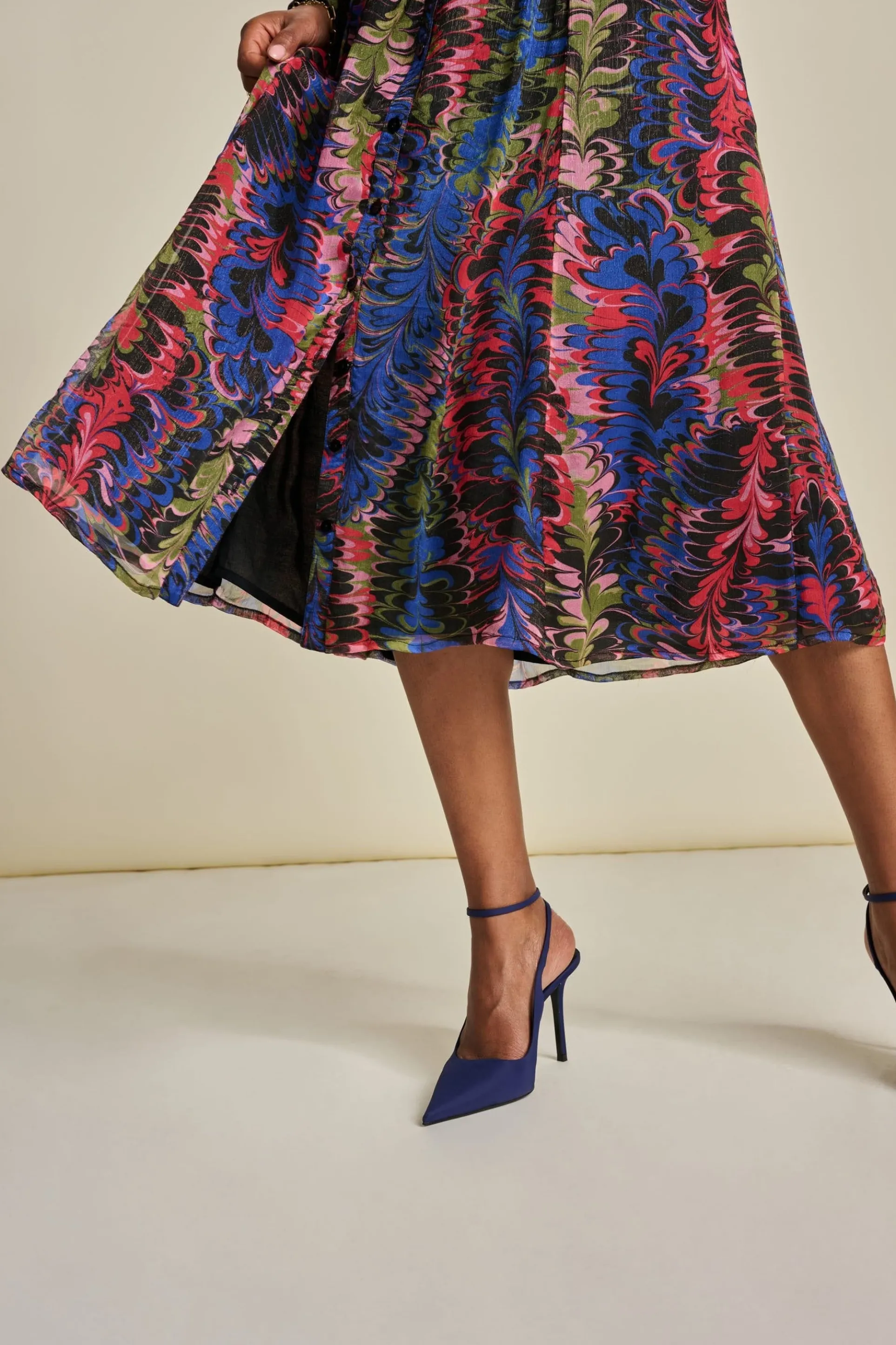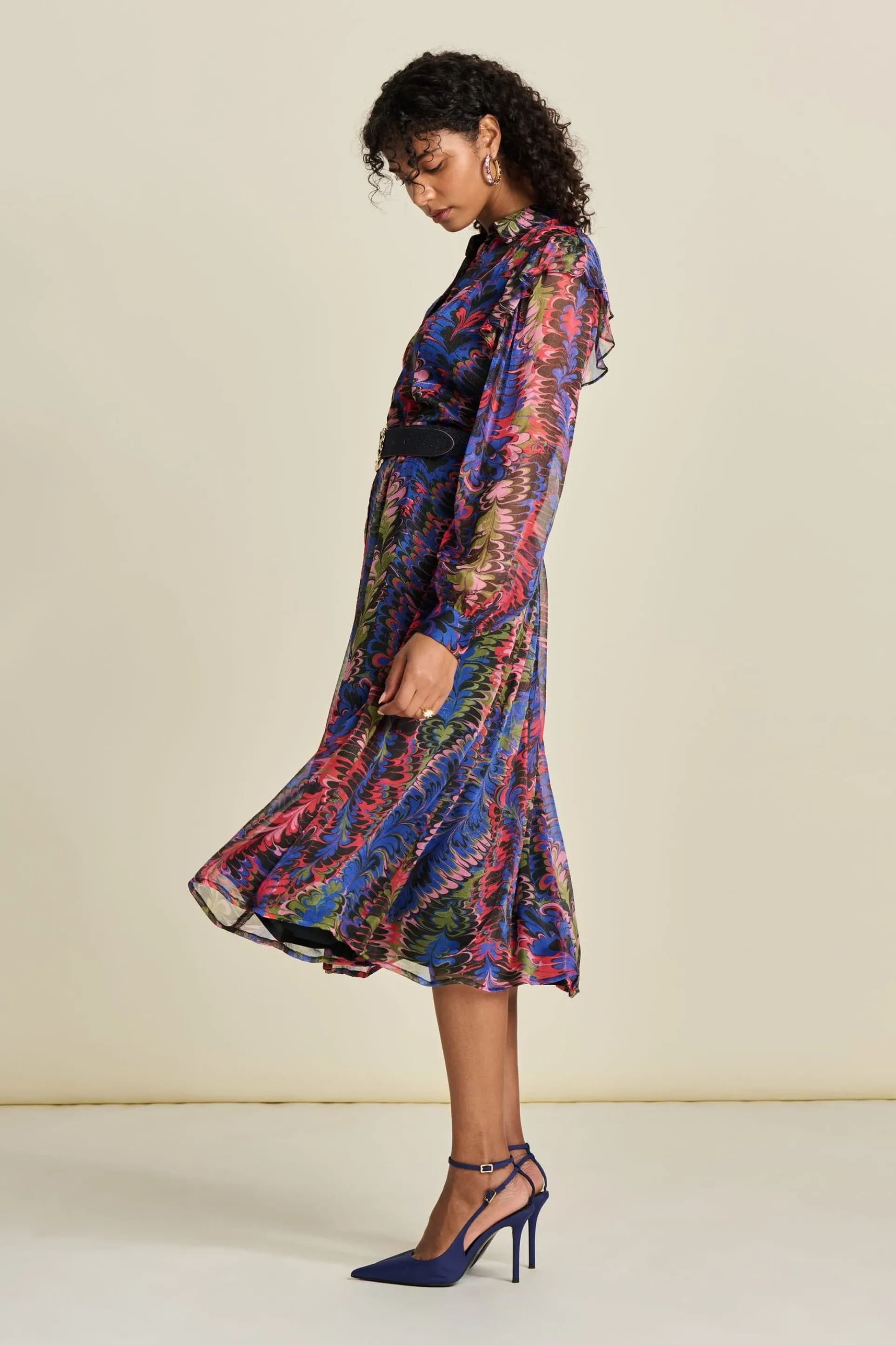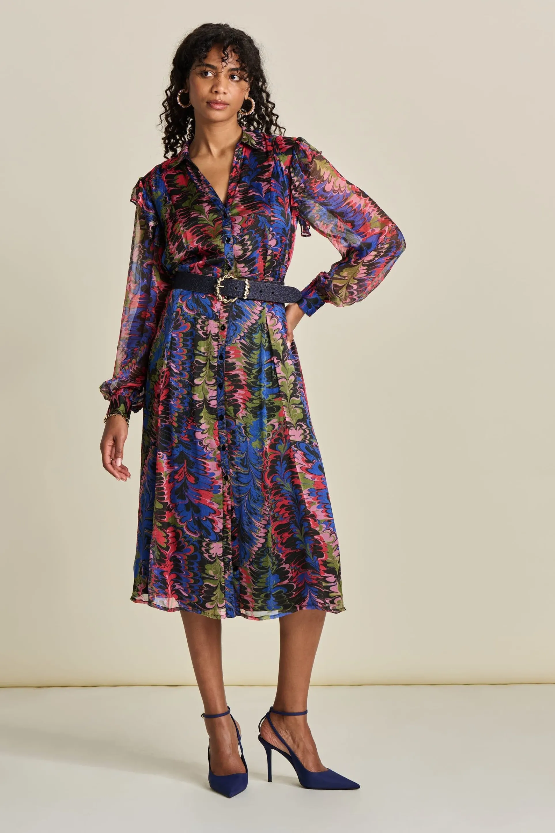 Deze semi transparante midi-jurk heeft een kleurrijke print met lurexdetails. De print is geïnspireerd op de sierlijke veren van een pauw. De stof van de jurk is semi transparant. De jurk is gemaakt van 93% viscose, waardoor dit item ‘more sustainable’ is.